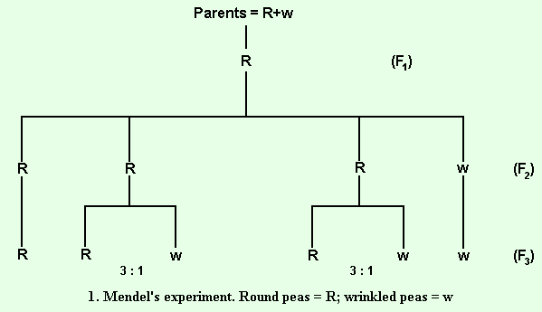 In one of his experiments, Mendel cross-pollinated a variety of pea having round seeds when ripe with one having wrinkled seeds when ripe. This he effected by removing the unripe stamens from unopened flowers of one variety and then, when the stigmas were ready for pollination, he placed pollen on them from the other variety. When the ripe pods so produced were examined, all the peas in them were found to be round. This was the case whichever variety was used as the 'female' parent, i.e. the one used to receive pollen from the other. These peas Mendel called the first filial generation (designated Fl in diagram). Mendel sowed these seeds the following year, and this time he allowed the flowers produced to be self-pollinated, as they normally are in the garden pea, provided insects are excluded. The ripe pods this time contained both round and wrinkled peas. He called these peas the second filial generation (F2), and on counting the two kinds found that there were 5,474 round and 1,850 wrinkled peas. The ratio of round peas to wrinkled was thus nearly 3:1. Mendel then proceeded to sow these peas in the next year, and again allowed the plants to be self pollinated. The wrinkled peas produced plants which bore only wrinkled seeds, but only one-third of the round peas produced plants bearing round peas only; the other two-thirds had pods containing both round and wrinkled peas in the former ratio of 3 round: 1 wrinkled. The result of this experiment may be summarized thus: