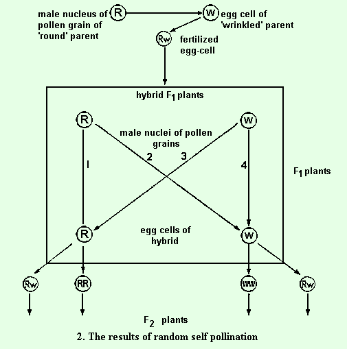 Segregation - When the 'germ cells' of the hybrids are formed, Mendel supposed that the opposed factors are separated (segregated), so that two kinds of pollen grains and of ovules are formed. These carry either one or other of the two factors but not both. Thus the hybrid 'round' pea plant produces some pollen grains carrying the 'round' factor and some carrying the 'wrinkled' factor and similarly the ovules. He supposed, moreover, that the two kinds of pollen grains and ovules were produced in approximately equal numbers, and that, on self-pollination, random (chance) combination of these two types of germ 'cells' would produce four possible combinations, also in approximately equal numbers, just as when tossing two coins (A and B) four results may occur: A1 and B1; A1 and B2, A2 and B1; A2 and B2. The result of this random pollination can be seen in figure 2.
